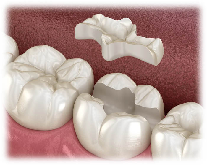 Цей тип реконструкції в основному призначається, коли зруйновано близько 30 % зуба. Як раніше, встановлювати велику за площею пломбу в таких випадках не рекомендується, адже при надмірному терті вони просідають. Також, якщо стінки цілі, а на жувальній поверхні глибокий карієс, то в таких випадках краще обрати керамічні накладки, які заповнюють зруйновану частину, як шматок пазлу.